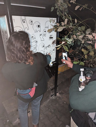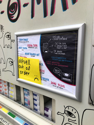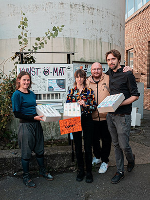 Der Kunstomat ist ein Herzensprojekt von Sahra (Kunstchapter), das schon vor der Pandemie den ersten Anlauf hatte. Im Mai 2023 hat sich dann ein neues Team gefunden, dass im Oktober die Installation und Eröffnung des Kunst-o-mat feiern durfte. Aus dem mechanische Zigarettenautomat wurde ein stummer Kunsthändler. Für ein paar Münzen Baargeld bekommt man eine kleine Schachtel gefüllt mit Kunst (Buttons, Sticker, Zeichnungen, Schmuck, Drucke, und mehr). Die technische Betreuung hat David (Studio) übernommen, Sahra (Kunstchapter) die Gestaltung der Infoblätter und Organisation, Joe (MöRa) hat auf dem Automaten AUGOs verteilt und Fabi (Studio) hat das Design der Schachteln gestaltet.